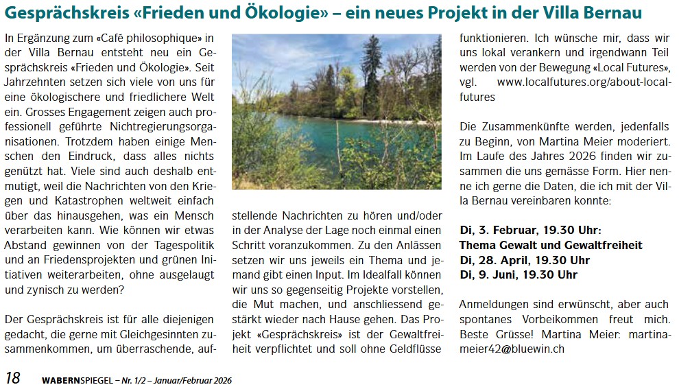 Gesprächskreis «Frieden und Ökologie» – ein neues Projekt in der Villa Bernau